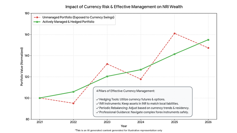 Currency risk is a significant factor for NRIs investing across borders. Exchange rate swings between the rupee and foreign currencies affect the INR value of global assets and income flows. Effective management includes: