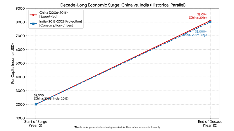 There’s a valuable historical parallel to consider. When China’s per capita income crossed 2,000 dollars in 2006, it signaled the start of a decade-long economic surge—growing almost fourfold to over 8,000 dollars by 2016. India crossed that same 2,000-dollar mark in 2019, suggesting that the next decade could mirror a similar phase of rapid income expansion, potentially taking India’s per capita income beyond 8,000 dollars before 2030.