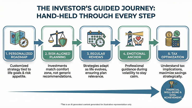 A wealth manager in India acts as your coach, guiding you through market emotions. Research by DALBAR shows investors underperform markets because they buy high and sell low. A trusted partner helps you stay the course and make informed financial decisions.