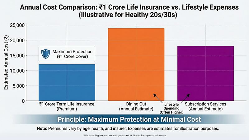 For a healthy individual in their 20s or 30s, a ₹1 crore cover can often cost less than what many people spend annually on dining out or subscription services. The exact premium varies by age, health, and insurer, but the principle is consistent: maximum protection at minimal cost.