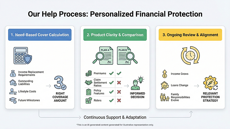 We assess income replacement requirements, outstanding liabilities, lifestyle costs, and future milestones to determine the right coverage amount — not an arbitrary number. - Product Clarity & Comparison